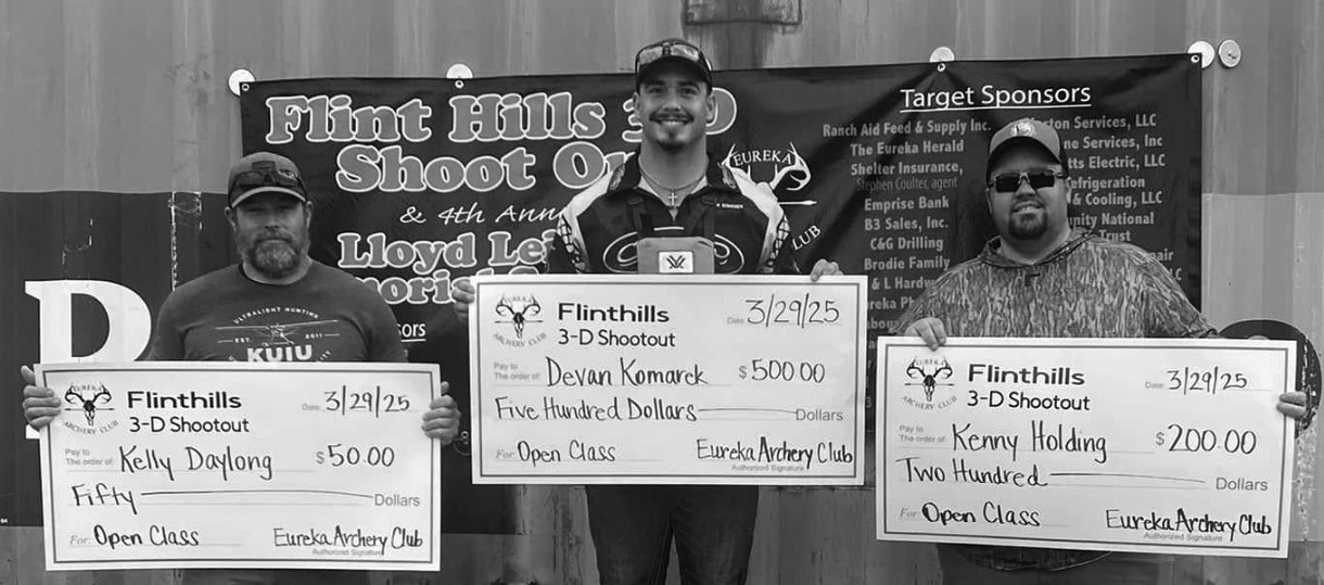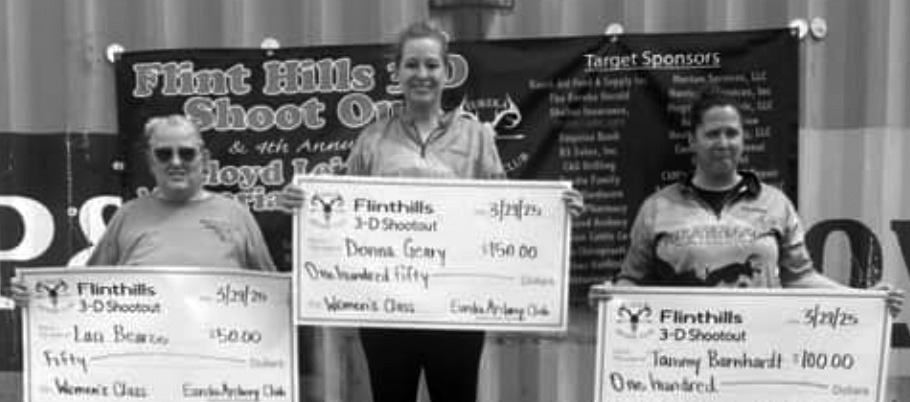 Flint Hills 3-D Shoot Out (Individual Shoot) Open Class 1st - Devan Komarek 2nd - Kenny Holding 3rd - Kelly Daylong Hunter Class 1st - Wylee Boulanger 2nd - Travis Keith 3rd - Matt Barnhardt Women’s Class 1st - Donna Geary 2nd - Tammy Barnhardt 3rd - Laci Bearce Traditional Class 1st - Mike Brush Youth Class 1st - Camden Wunderlich 2nd - Jerrett Barnhardt