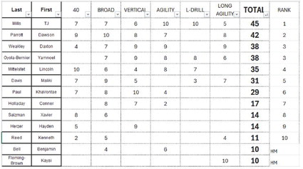 Quickness and change-of-direction ability shone in the pro-agility drill 1. Mills: 4.25 seconds 2. Weakley (Arkansas City High School): 4.3 seconds 3. Mittelstet (Jenks High School): 4.34 seconds L-Drill