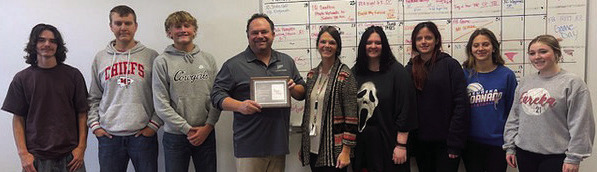 Current yearbook students are pictured with the Jostens representative and Fansler. Pictured from left to right are: Ashton Fansler, Henry Pfister, Cole Ptacek, Jostens representative Jake Wright, Yearbook teacher Fansler, Tiffany Larsen. Kimber Olsen, Elaina Osborne and Kinlee Sanchez.