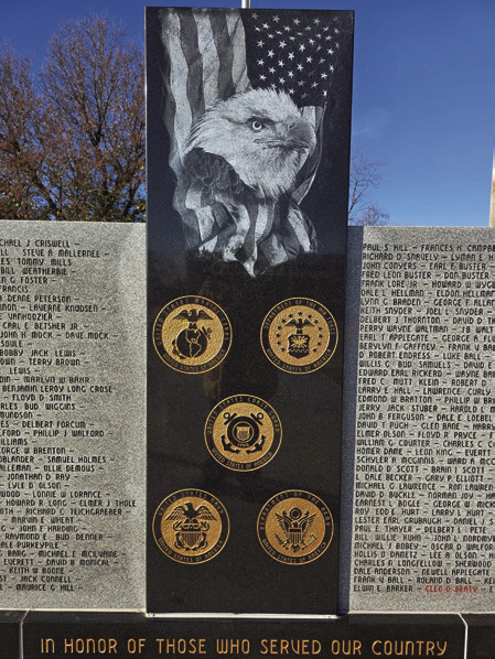 Following the structural work, the restoration effort focused on the visual elements and was finalized on Dec. 4 with the comprehensive repainting of all veteran names. The original coloring on the granite had nearly disappeared, but every name has now been restored in a black paint. Those veterans who made the ultimate sacrifice for their country are distinctly highlighted in red. Additionally, the central features, the Eagle and Flag carving, and the Branch Seals, were all professionally restored to their original vibrancy.
