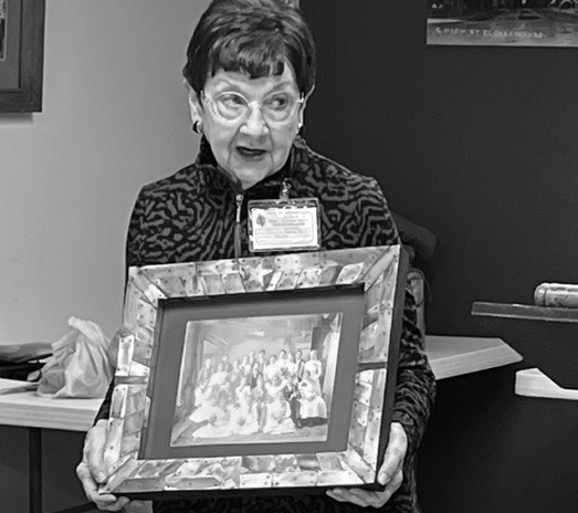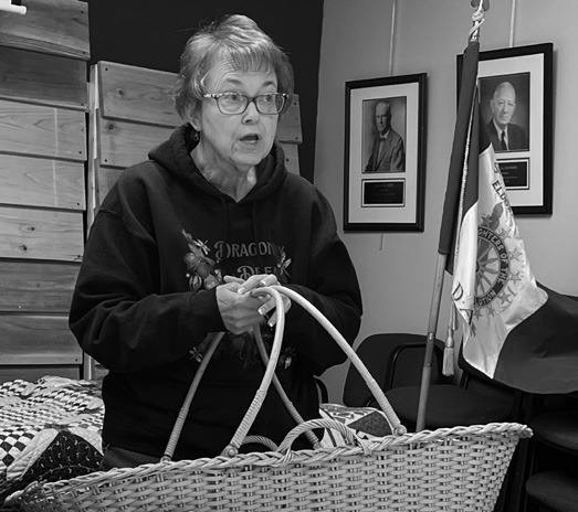 Along with the quilts, members brought antiques to share. There were many different kinds of items shared, everything from a plaque and a humerous story of the legend of the Jackalope by Carla Cook, to a family story about the Enterprise School of Butler County by Bachman, to a picture depicting ranch animals with a hand-made frame made of cow horns and a story about the Munger Ranch in Greenwood County by Marilyn Seymour. Another great antique was a basket that carried orphans to an orphanage in South Dakota from Connie Mitchell. The oldest antique shared was a perfume bottle from member Ann Wimberly’s great-grandmother, in which one could still smell the scent!