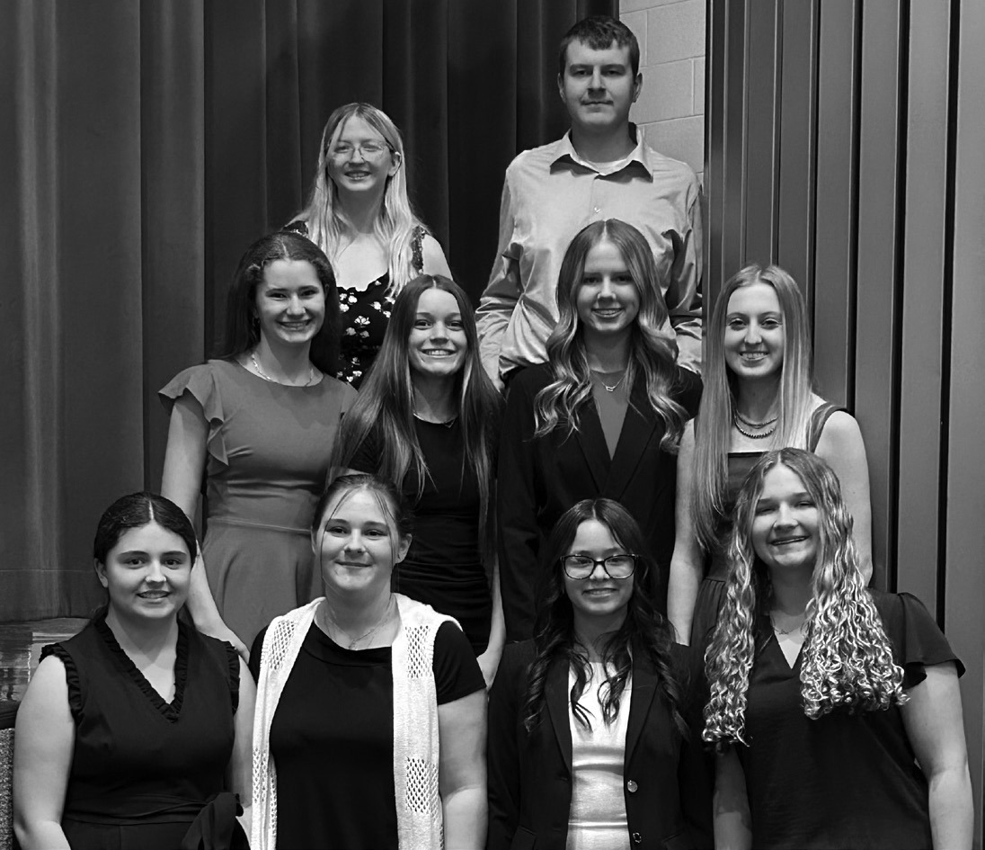 Current members also gathered for a photo at the ceremony. Pictured above from left to right are: front row, new members: Seiter, Baumgartel, Bogle, Alford, Osborne, Pfister, Lindamood, Shepherd, Cox and Sanchez; and back row: Alaina Westerman, Elle Coulter, Madelyn Miller, Ava Noble, TJ Mills, Hannah Perrier, Harlie Owings, Lydia Mason, Addison Westerman and Britta Mongeau.